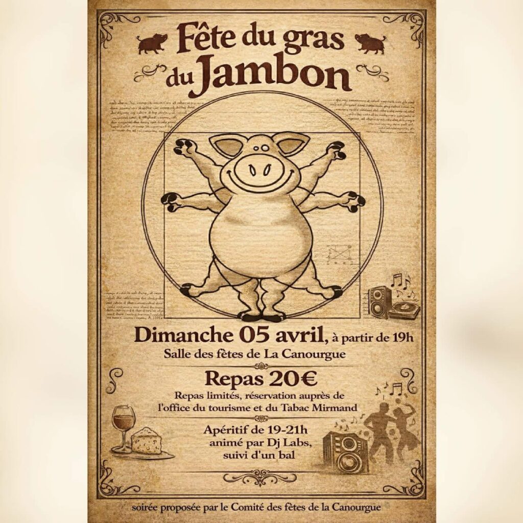 Dimanche 5 avril à partir de 19h à la Salle des Fêtes de La Canourgue, pour la fête du gras du jambon, un repas animé (20€) suivi d’un bal.